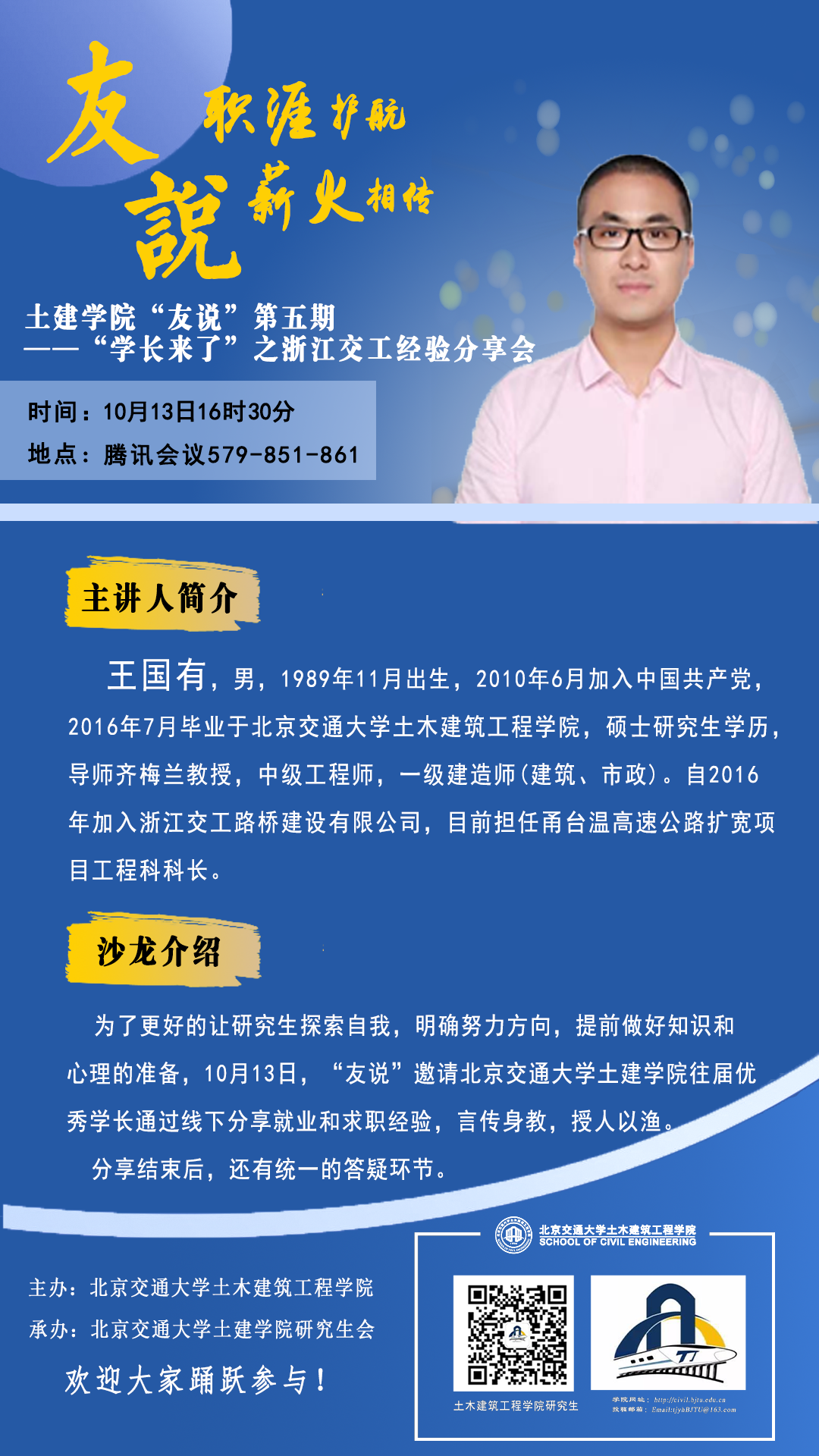 “友说”第五期“学长来了”为大家邀请了星空电竞app2026最新版土建学院往届优秀学长通过线上分享就业和求职经验,言传身教,授人以渔。