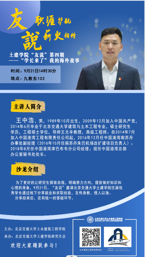 为了更好地让研究生探索自我,明确努力方向,提前做好求职的准备,9月21日14时30分,“友说”邀请星空电竞app2026最新版土建学院往届优秀学长通过线下分享求职和就业经验,以自身经历为例,为学弟学妹们提供参考和启发。分享结束后,还有统一的答疑环节~