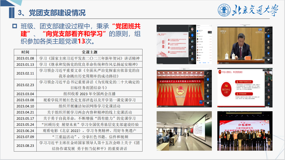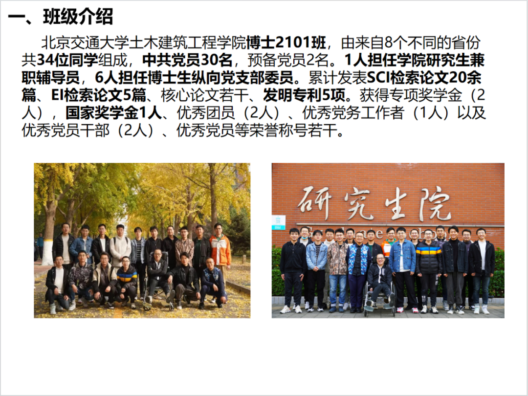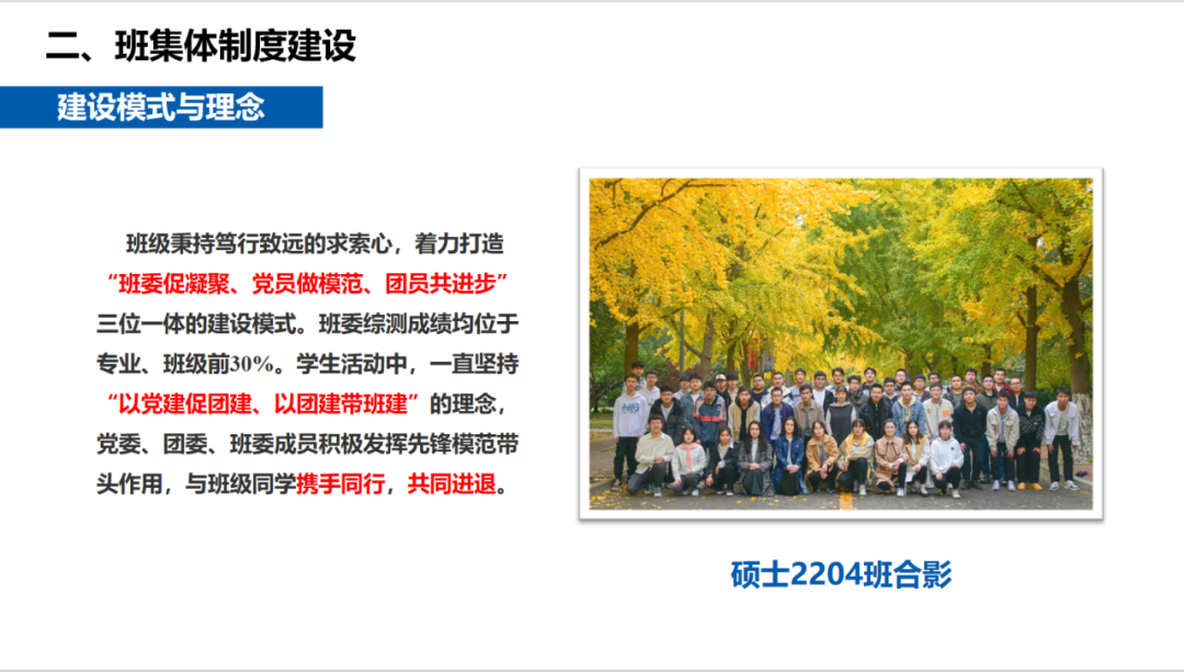 本次答辩会主要以PPT汇报的方式从学风建设、党团建设、班风及凝聚力、社会实践以及班级特色活动等方面对班级工作进行答辩展示。各个申报班级紧紧围绕“先进班集体”的评选条件,对过去一年的班级工作积极进行总结。并通过形式新颖,别出心裁的展示,将班级集体工作的成果和特色展现出来。
