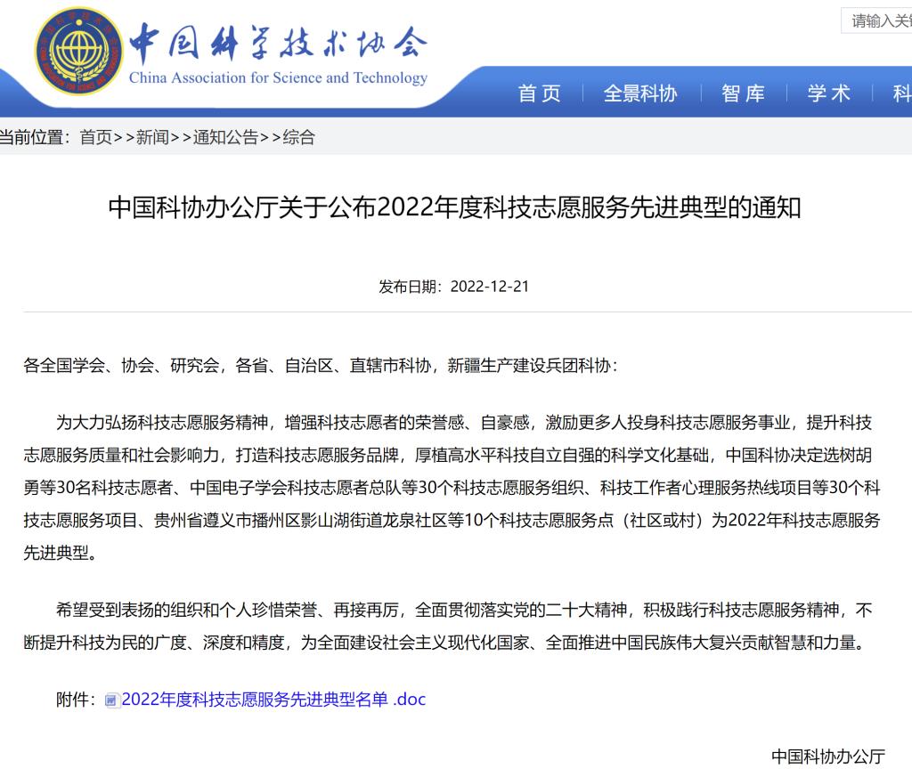 近日,中国科协发布《中国科协办公厅关于公布2022年度科技志愿服务先进典型的通知》(科协办函宣字[2022]132号),经由校科协组织申报、北京市科协推荐,我校交通运输学院罗昊被评为2022年度科技志愿者先进典型。