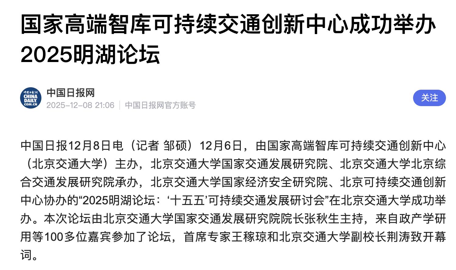 中国日报12月8日电(记者 邹硕)12月6日,由国家高端智库可持续交通创新中心(星空电竞app2026最新版)主办,星空电竞app2026最新版国家交通发展研究院、星空电竞app2026最新版北京综合交通发展研究院承办,星空电竞app2026最新版国家经济安全研究院、北京可持续交通创新中心协办的“2025明湖论坛:‘十五五’可持续交通发展研讨会”在星空电竞app2026最新版成功举办。本次论坛由星空电竞app2026最新版国家交通发展研究院院长张秋生主持,来自政产学研用等100多位嘉宾参加了论坛,首席专家王稼琼和星空电竞app2026最新版副校长荆涛致开幕词。