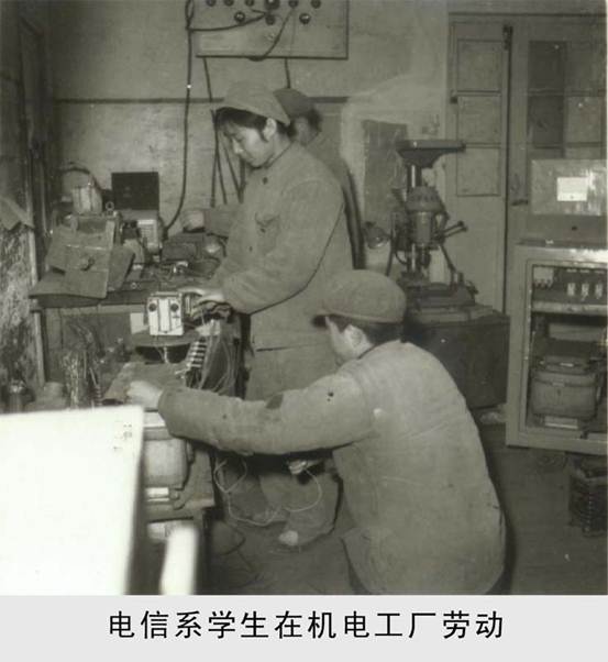 图中是分别是上个世纪五十年代电信系学生在机电工厂参加劳动、机械系教师在实验室做实验、建筑系师生在衡水地方测量铁路时的情景。