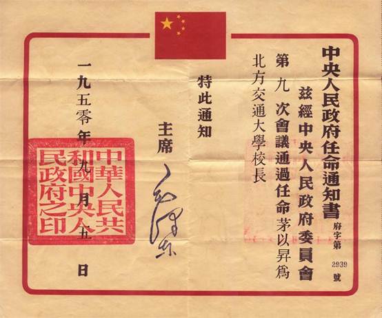 1951年4月24日,铁道部办公厅通知校部,说毛主席题字已写好,要负责人马上到中央人民政府办公厅(新华门内)去取,随后又来了个部文。金士宣副校长接到通知后,立即坐上校部的小汽车直接到新华门内中央人民政府办公厅取回题字。