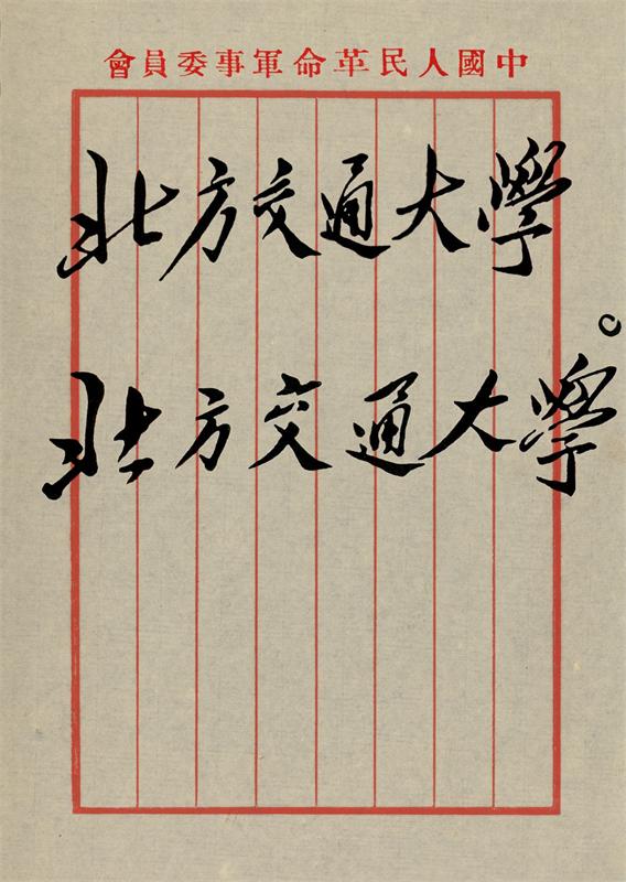 1951年3月9日,校部又就请毛主席题写校名的事向中央人民政府办公厅递送了报告。当时全国抗美援朝运动汹涌澎湃,5月1日就要举行抗美援朝示威游行,题字一事一直没有回音,全体师生员工请求毛主席快些题字的心情非常迫切。4月11日,校部又向滕代远部长写了一个报告,要求滕部长当面请求毛主席给学校题写校名。滕部长见信后,就找了个机会,于4月20日到了毛主席那儿,当面向毛主席转达了学校师生员工的热切希望。隔了二三天,毛主席在一张“中国人民革命军事委员会”信笺上,写了两行“北方交通大学”的字样,并在下行的右上角划了个小圈,表示该行字写得较满意,要选择的话可选择这行。题字下方没有落款,也没有年月日注。