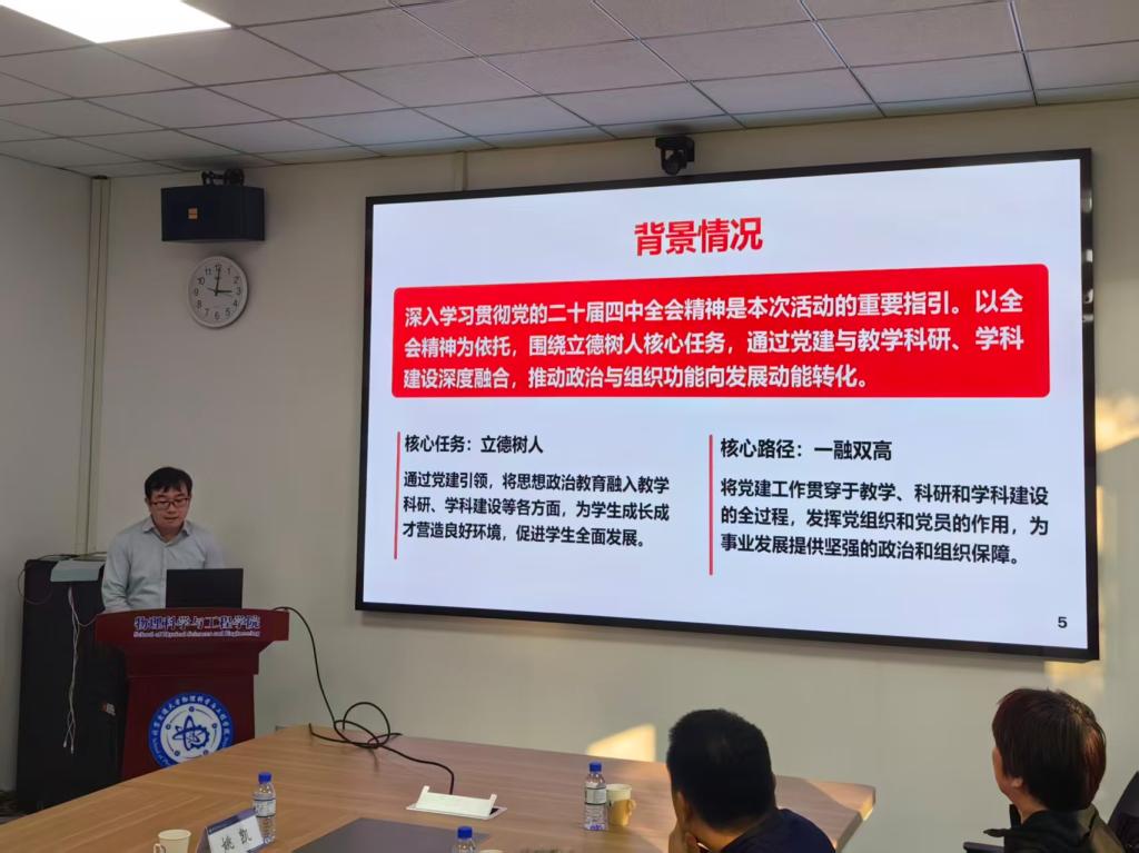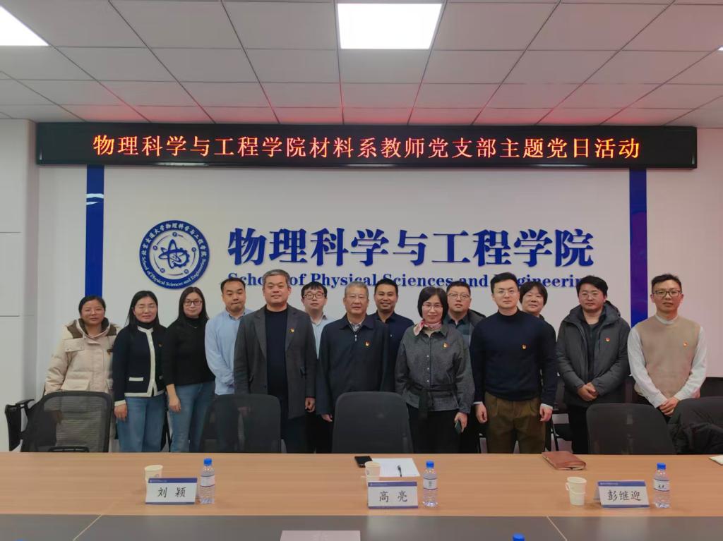 为深入学习贯彻党的二十届四中全会精神,推动党建与业务深度融合,12月17日下午,物理科学与工程学院材料系教师党支部开展主题党日活动。学校党委常委、副校长高亮,学院党委副书记刘颖,副院长彭继迎、副院长姚凯,材料系党员和教师代表参加活动。活动由材料系教师党支部书记杨一君主持。