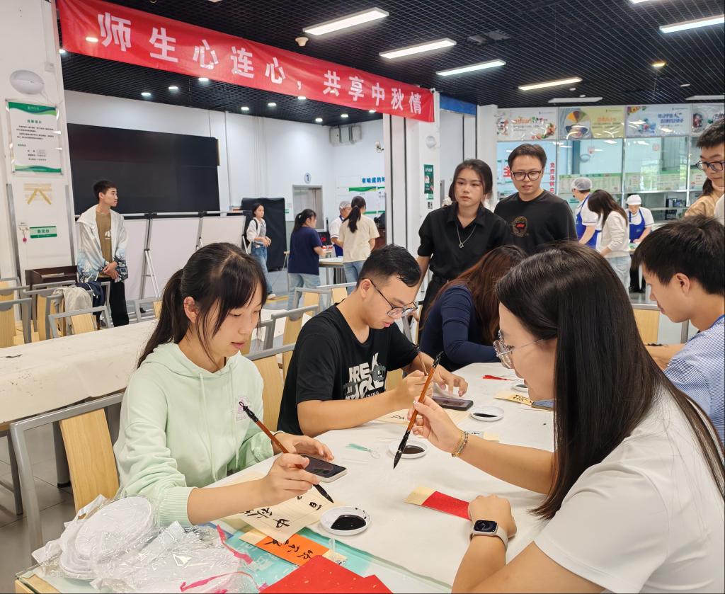 在书法撰写环节,学生书画协会的同学进行相关指导。大家或写中秋诗句,或题节日寄语,笔墨间寄托思念与祝福,彰显了中华书法艺术的独特魅力。整个现场沉浸于墨香与节日氛围之中。