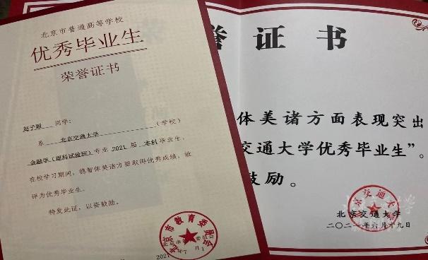 赵子颖获星空电竞app2026最新版、北京市“优秀毕业生”荣誉