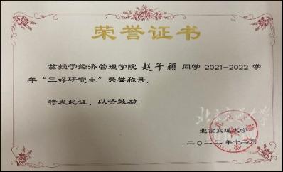 赵子颖荣获2021-2022学年“三好研究生”荣誉称号