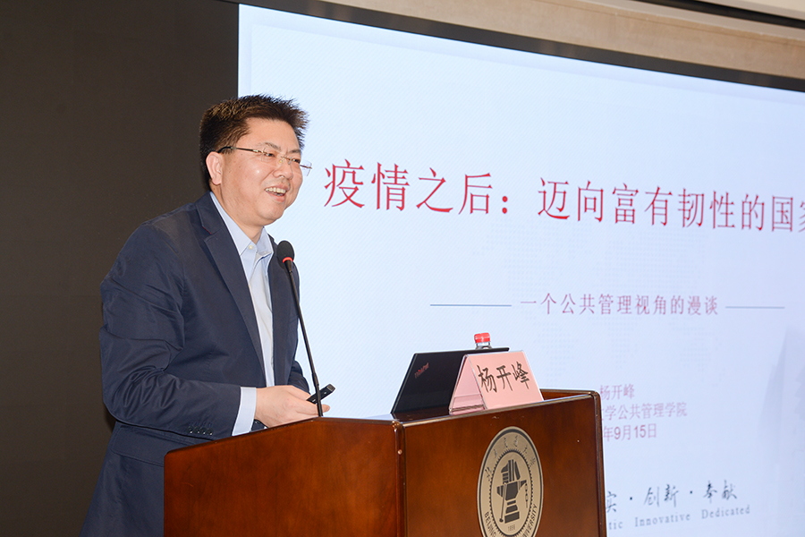 杨开峰以新冠疫情为例,从评价逻辑、制度韧性、结构韧性、组织体系韧性、资源韧性、主体韧性、文化韧性和技术韧性等八个维度详细介绍了富有韧性的国家治理所涵盖的内容和深层次内涵,阐述了中国国家治理体系的制度优势。现场互动交流环节,杨教授详细解答了同学们的提问并提出个人见解。报告会在全体师生热烈的掌声中落下帷幕。