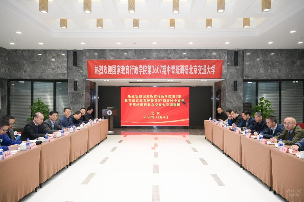 2022 年 11 月 4 日下午,国家教育行政学院第 3 期教育部直属系统暨第 67 期高校中青年干部培训班一行在班主任刘益东,团长、中国人民大学马克思主义学院党委书记、常务副院长王易带队下来校开展实地参观和调研座谈。校长、党委副书记王稼琼亲切会见调研团一行。党委副书记、副校长孙守光出席座谈会并致辞,党委副书记文海涛参与会见,党委常委、宣传部长蓝晓霞主持调研座谈会。