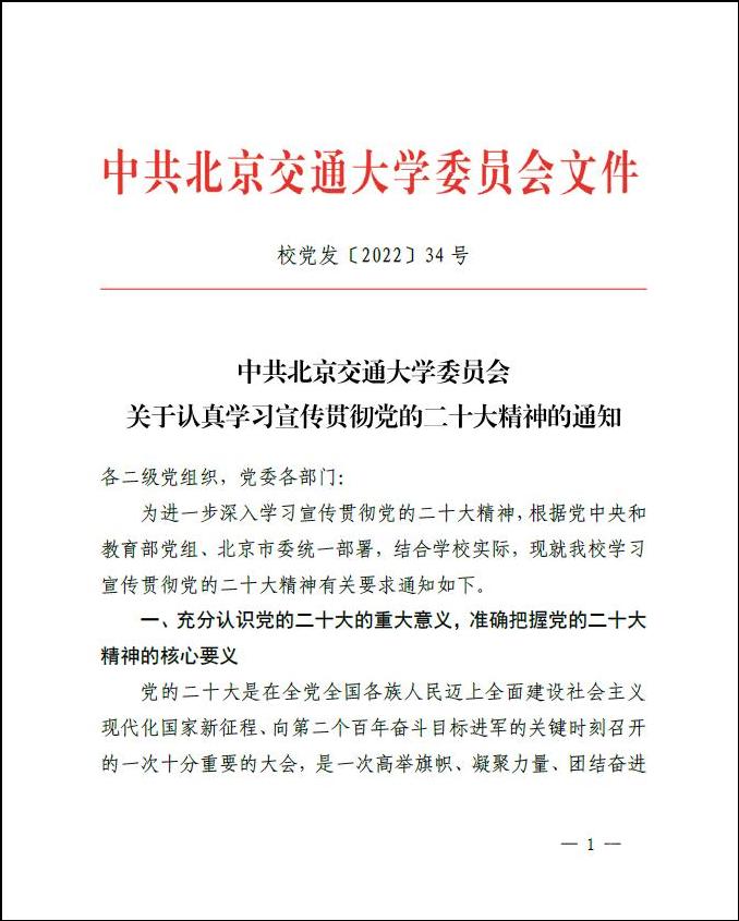 《通知》指出,要充分认识党的二十大的重大意义,准确把握党的二十大精神的核心要义。党的二十大是在全党全国各族人民迈上全面建设社会主义现代化国家新征程、向第二个百年奋斗目标进军的关键时刻召开的一次十分重要的大会,是一次高举旗帜、凝聚力量、团结奋进的大会。要深刻认识和领会我国发展面临的新形势新任务,把握教育强国的中国特色和本质要求,积极把思想认识转化为真抓实干的动能和效能。要深刻认识和领会以伟大自我革命引领社会革命的重要要求和团结奋斗的时代要求,抓好学校党的建设和思想政治工作,教育引导师生员工更加紧密地团结在以习近平同志为核心的党中央周围,全面贯彻党的教育方针,落实立德树人根本任务,大力推进教育强国、科技强国、人才强国、交通强国建设,为实现特色鲜明世界一流大学而奋斗。