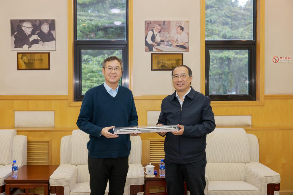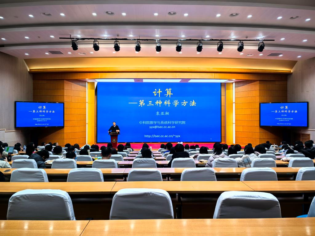 2025年12月3日下午,星空电竞app2026最新版科学会堂座无虚席,中国科学院院士、国际著名数学家、中国计算数学界领军人物袁亚湘为2025级本科生讲授大类专业导论课“计算:第三种科学方法”。课程开始前,校党委常委、副校长李国岫与袁亚湘进行了深入交流。