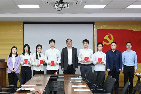 姚念龙和学院教师党员代表为党支部新发展党员佩戴党徽并发放《中国共产党章程》等相关学习资料。