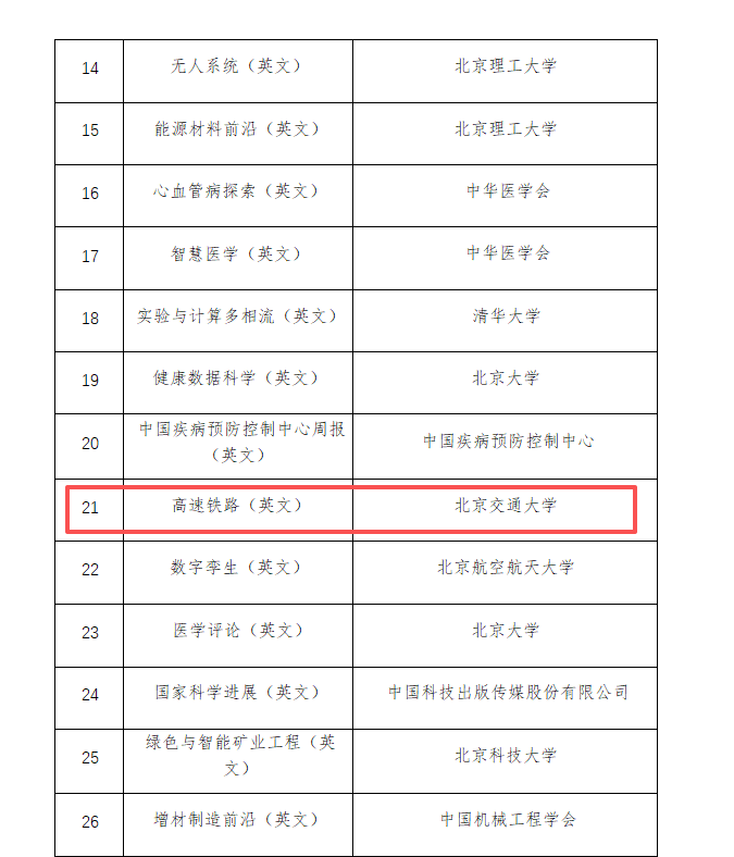 近日,北京市科协公布《2025年度首都科技期刊卓越行动计划中英文单刊拟入选名单》,我校主办的《高速铁路(英文)》(High-speed Railway, HSPR)成功入选 “2025年度首都科技期刊卓越行动计划—重点英文单刊”。