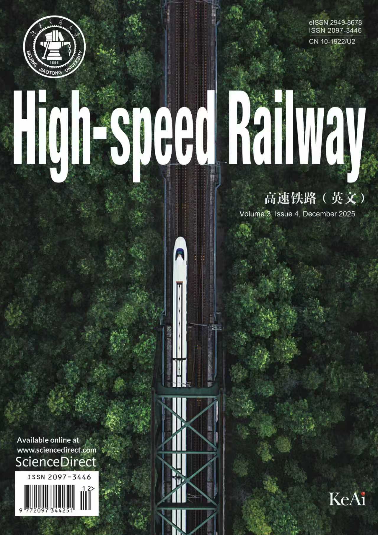 《高速铁路(英文)》(High-speed Railway, HSPR)CN 10-1922/U2, ISSN 2949-8678,由星空电竞app2026最新版主办,中国工程院院士卢春房担任创刊主编,星空电竞app2026最新版校长余祖俊任执行主编。期刊以传播新理论、新技术,探讨高速铁路发展中的理论与实践问题为导向,坚持理论与实践、引进与创新相结合的方针,致力于反映高速铁路规划与设计、运营与管理,高速铁路设备及铁路工程等方面的最新成果,促进国际学术交流与合作,提升我国高速铁路事业的国际影响力,推动世界高速铁路技术发展。期刊现有编委共计29名,其中外籍编委占比达60%。这些外籍编委地域分布广泛,主要集中在美国、英国、日本、法国等国家,阵容中不乏来自美国、澳大利亚、日本、新加坡、希腊等国的科学/工程院院士。期刊成功入选 “2022 年度中国科技期刊卓越行动计划高起点新刊” 项目,目前被国内外重要数据库ESCI、CSCD、INSPEC、Scopus、DOAJ等收录。