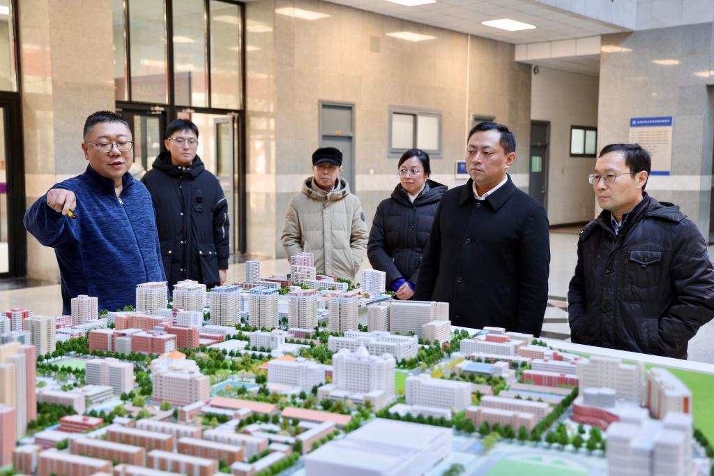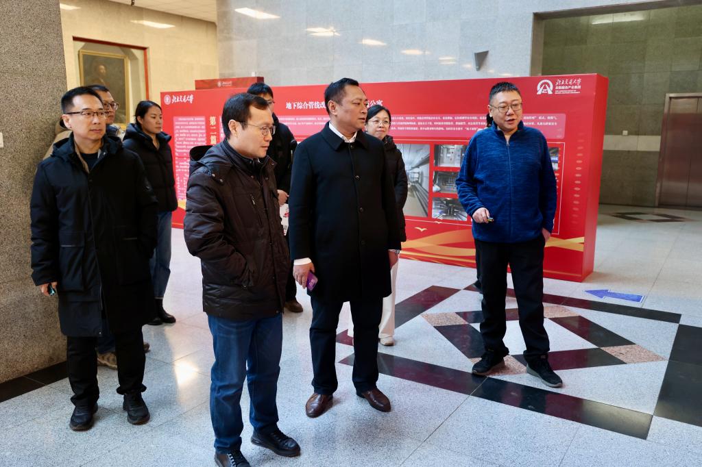 2025年12月16日下午,党委常委、副校长艾渤在思源楼一层大厅参观学校地下综合管线改造项目成果展。后勤集团班子成员陪同参观。