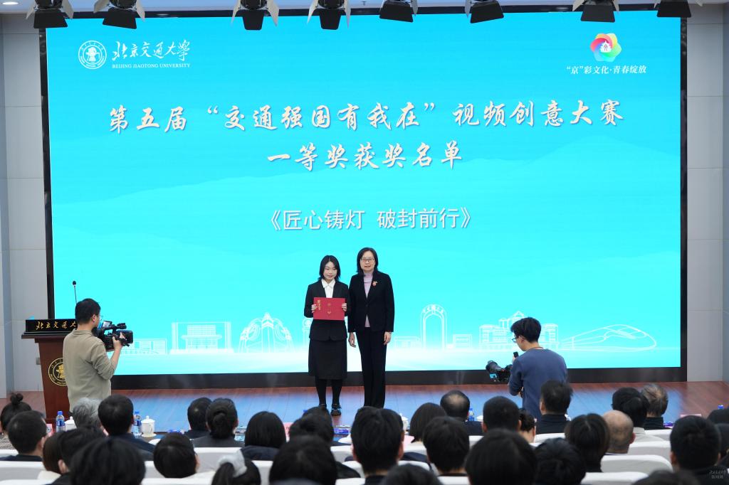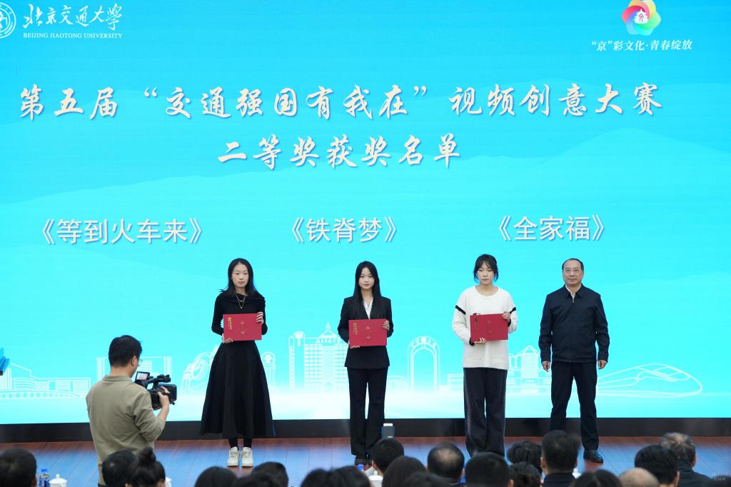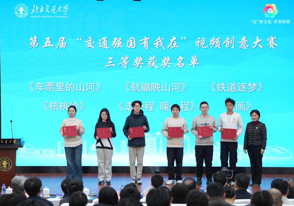 文海涛、李国岫、蓝晓霞分别为学校第五届“交通强国有我在”视频创意大赛一、二、三等奖获奖代表颁奖。