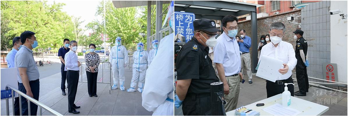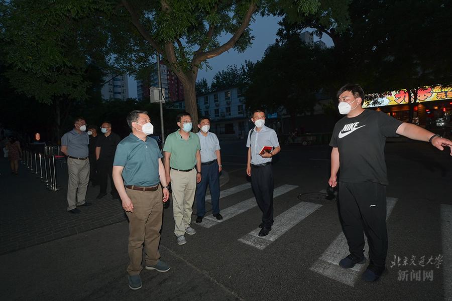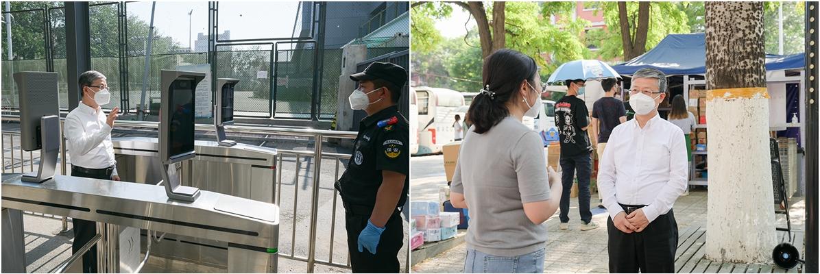 当前,北京市疫情防控正处于关键时期,我校启动了校园全封闭管理,书记、校长带头住校指挥,全体校领导实行AB角管理,根据工作需要住校工作,学校防疫和保供等必要人员全部住校工作。近日,党委书记黄泰岩、校长王稼琼分别带队检查指导校园各重点场所疫情防控工作并慰问一线防控工作人员。北京市教育“两委”联络员刘金毫、党委副书记许安国、校长助理郑广天参加检查工作。