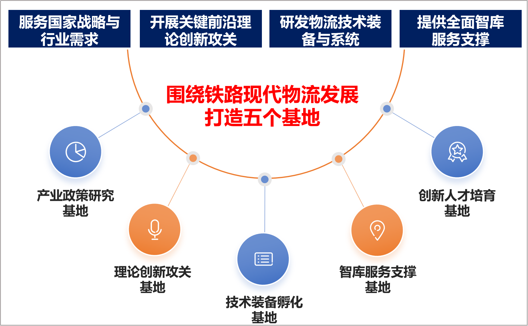 中心围绕铁路现代物流体系建设的关键问题开展系统性、关键性、原创性研究,重点在产业政策研究、理论创新攻关、技术装备孵化、智库服务支撑、创新人才培育等方面开展工作,充分发挥“沟通上下游、融合路内外、联系产学研”的桥梁作用,主动促进成果转化应用,打造铁路现代物流研究的产业政策研究基地、理论创新攻关基地、技术装备孵化基地、智库服务支撑基地、创新人才培育基地,全面服务和支撑铁路“六个现代化”和铁路现代物流体系建设。