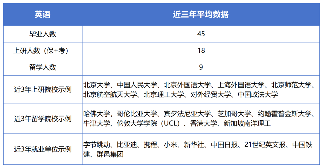 英语专业(语言智能方向)坚持重技术、厚基础、宽口径培养模式,课程设置对标国家“四新”建设对人工智能时代语言战略人才的需求,突出国际交流能力、跨学科融通力和语言战略技术能力的培养,提倡实践与探索,坚持能力培养和专业知识建构并举,国际化跨学科人才培养成果丰硕,毕业生深造率高且覆盖国内外顶尖高校,从业口径宽、发展潜力大。